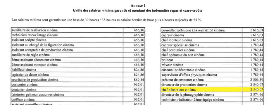 Tabla salarial de la ASSOCIATION DES CHEFS DÉCORATEURS DE CINÉMA: http://www.adcine.com/qui-sommes-nous