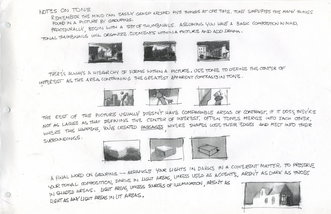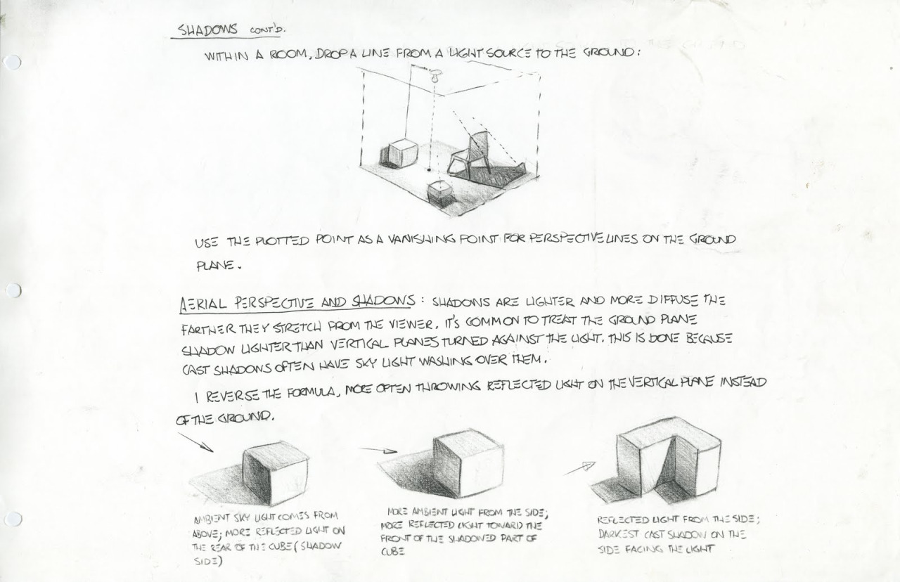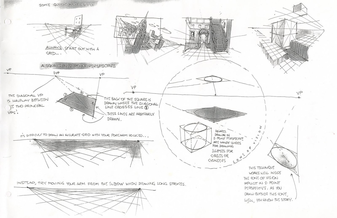 Sin embargo, una de las recopilaciones más alucinantes del trabajo de Paul no pertenece a ningún proyecto cinematográfico. Estas son una serie de notas sobre los principios más elementales del dibujo a mano alzada, en las que de su puño y trazo describe las técnicas con las que construye sus ilustraciones. Wonderful stuff.
